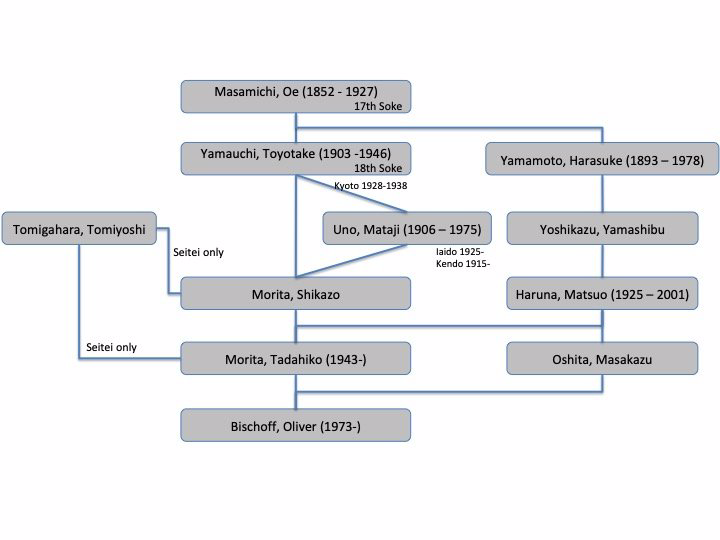 Morita Shikazo sensei studied first under Yamouchi Toyotake sensei when he first moved to Kyoto 1928. After the Death of Yamauchi Toyotake sensei in 1946 Morita, Shikazo sensei continiued to study under the supervison of his sempai Uno Mataji sensei (1906-1975) who continued the tradition of the Yamauchi-Ha lineage.